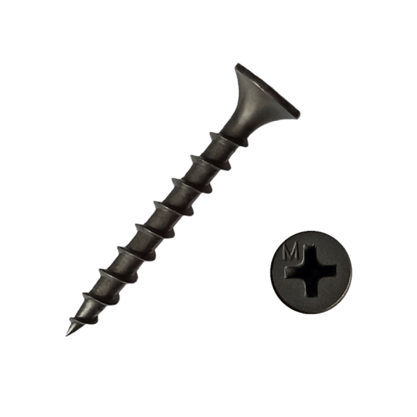 Метиз представляет собой классический остроконечный шуруп с резьбой по всему стержню. Имеет фосфатное покрытие, надёжно защищающее от коррозии, плоскую шляпку с крестообразным шлицем Phillips № 2 и маркировкой "М".