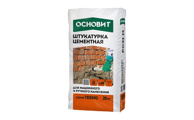 Штукатурка цементная ручного и машинного нанесения ОСНОВИТ ТЕХНО PC21 M для выравнивания стен из бетона, кирпича, пено- и газобетона. Отделка фасадов и помещений с любым уровнем влажности. Наносится слоем от 5 до 30 мм без штукатурной сетки.